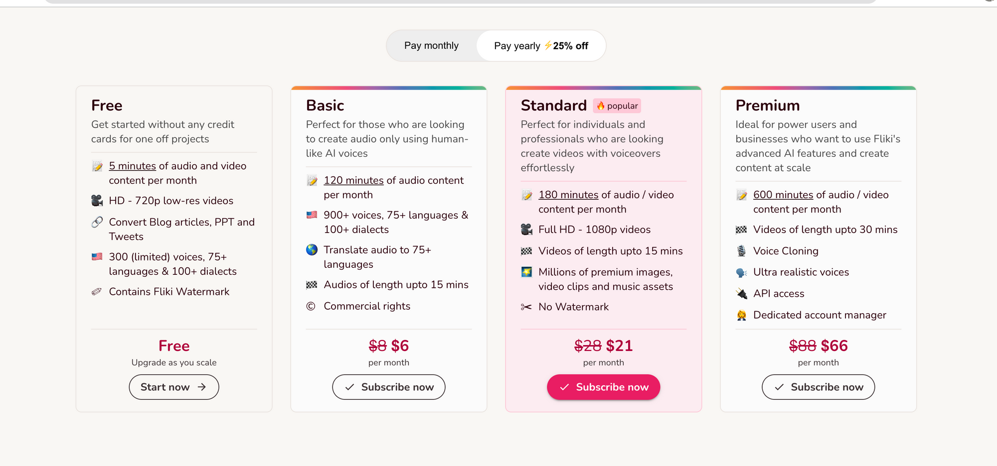 Like most AI voice generators and video tools on the internet, Fliki AI is initially free to use, but has paid plans in case you want to scale your content, and up your AI voice and video generation game.