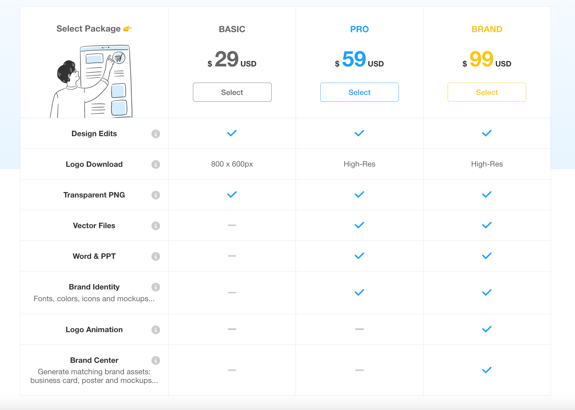 LogoAI, currently, isn't available for free and has three different price plans to choose from. Here are those explained