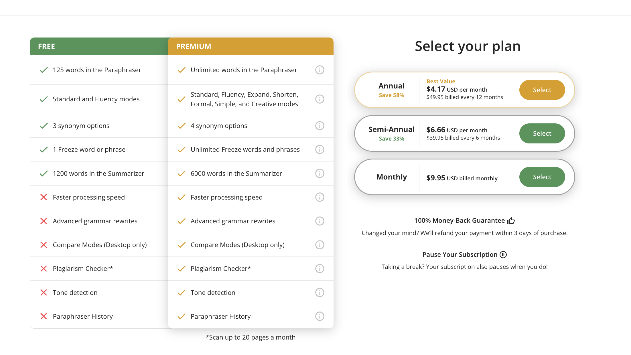 - Premium Plan (from $4.17/month): 7 Paraphrasing modes, unlimited words, 6k words in the summarization tool, plagiarism detected, tone detection, and more.