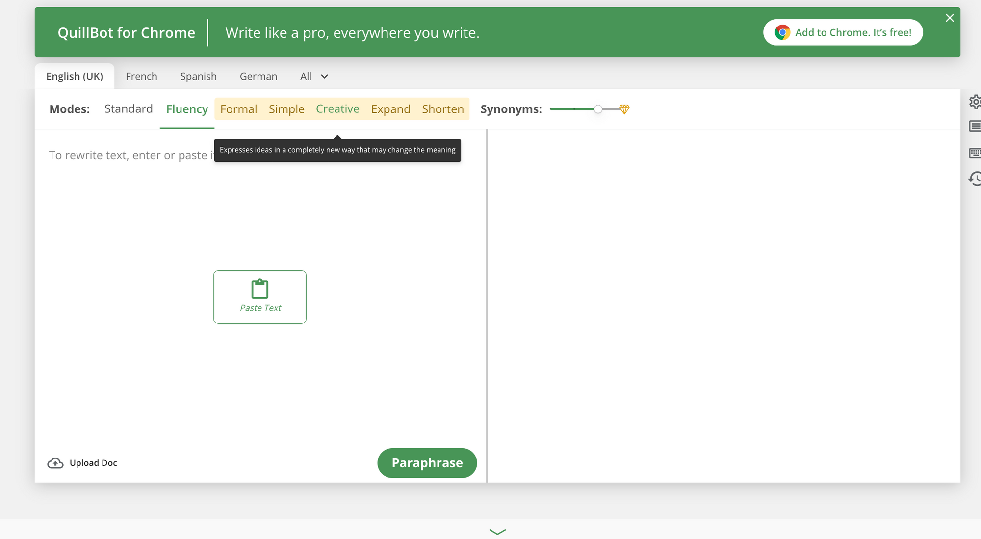 - Basic Plan(free): 125 word limit on the paraphrasing tool, 3 synonym options, and two paraphrasing modes