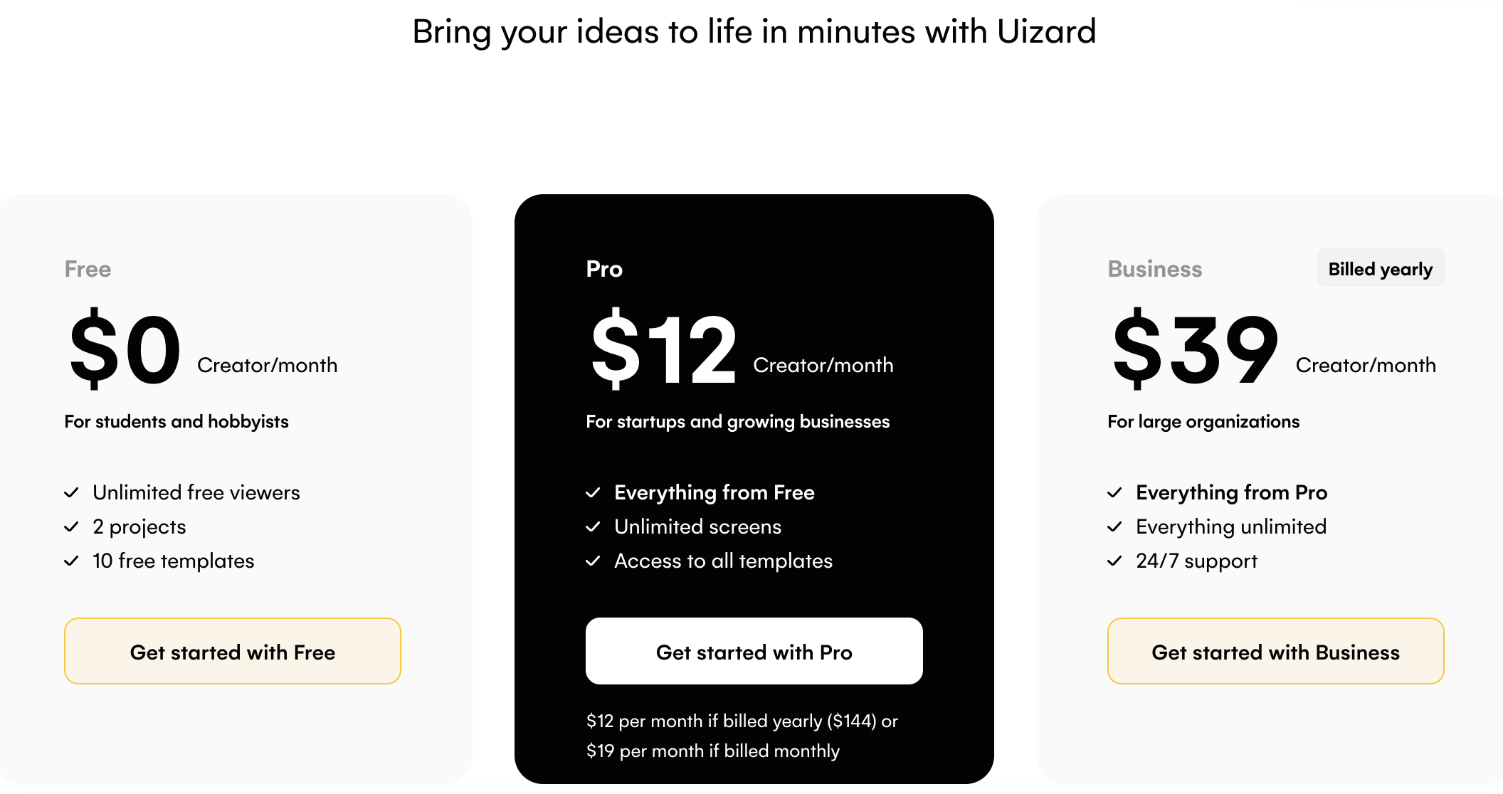 - Business Plan ($5/month): Fullscale access to all features, with priority support from Uizard